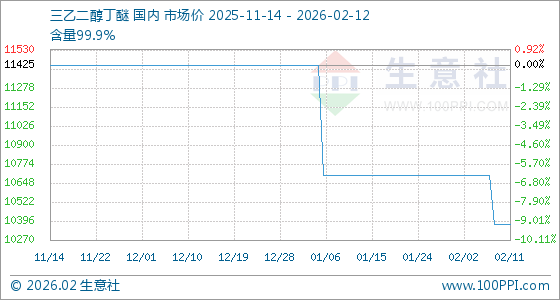 2月12日,生意社三乙二醇丁醚基准价为10375.00元/吨,与本月初(10700.00元/吨)相比,下降了3.04%。