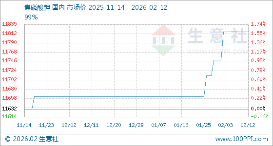 2月12日,生意社焦磷酸钾基准价为11816.67元/吨,与本月初(11750.00元/吨)相比,上涨了0.57%。