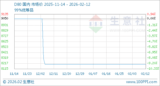 2月12日,生意社D80基准价为8200.00元/吨,与本月初持平。