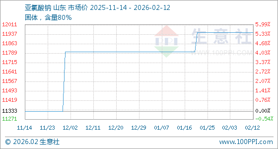 2月12日,生意社亚氯酸钠基准价为11950.00元/吨,与本月初持平。