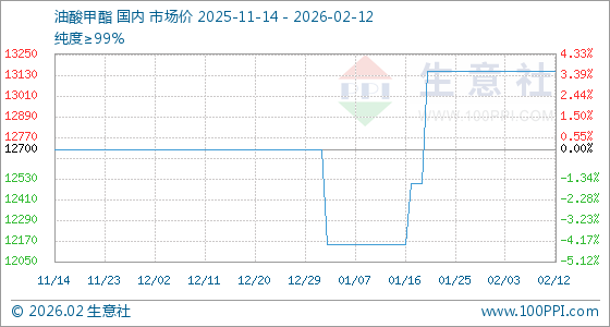 2月12日,生意社油酸甲酯基准价为13150.00元/吨,与本月初持平。