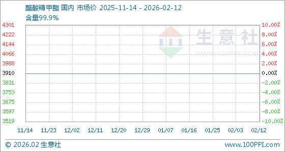 2月12日,生意社醋酸精甲酯基准价为3910.00元/吨,与本月初持平。