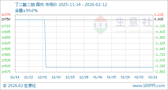 2月12日,生意社丁二酸二钠基准价为10500.00元/吨,与本月初持平。