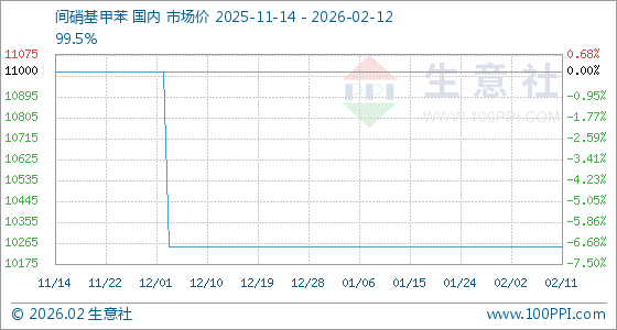 2月12日,生意社间硝基甲苯基准价为10250.00元/吨,与本月初持平。