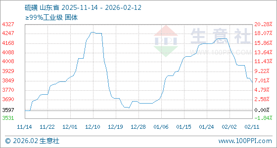 2月12日,生意社硫磺基准价为3833.33元/吨,与本月初(4210.00元/吨)相比,下降了8.95%。
