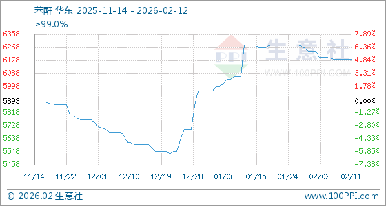 2月12日,生意社苯酐基准价为6183.33元/吨,与本月初(6243.33元/吨)相比,下降了0.96%。