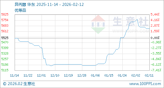 2月12日,生意社异丙醇基准价为5650.00元/吨,与本月初(5733.34元/吨)相比,下降了1.45%。