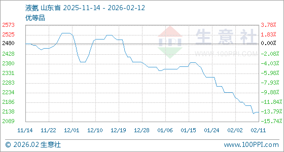 2月12日,生意社液氨基准价为2136.67元/吨,与本月初(2236.67元/吨)相比,下降了4.47%。
