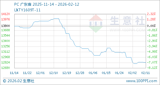 2月12日,生意社PC基准价为12826.67元/吨,与本月初(12966.67元/吨)相比,下降了1.08%。