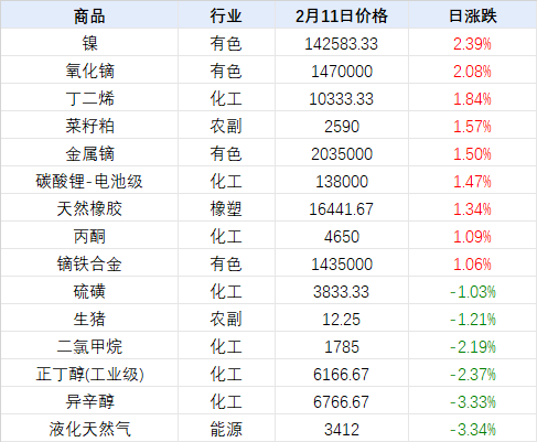 据生意社价格监测,2026年2月11日大宗商品价格涨跌榜中环比上升的商品共30种,集中在化工板块(共10种)和有色板块(共7种),涨幅前3的商品分别为镍(2.39%)、氧化镝(2.08%)、丁二烯(1.84%)。环比下降的商品共26种,集中在化工(共9种)和能源(共5种),跌幅前3的商品分别为液化天然气(-3.34%)、异辛醇(-3.33%)、正丁醇(工业级)(-2.37%)。