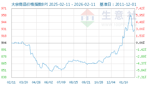 2月11日大宗商品价格指数BPI为930点, 与昨日持平 , 较周期内最高点1343点(2021-10-19)下降了30.75%,较2016年02月03日最低点660点上涨了40.91%。(注:周期指2011-12-01至今)