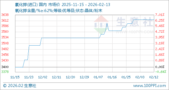 2月13日,生意社氯化钾(进口)基准价为3616.67元/吨,与本月初持平。