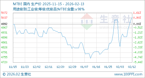 2月13日,生意社MTBE基准价为5043.33元/吨,与本月初(5023.33元/吨)相比,上涨了0.40%。