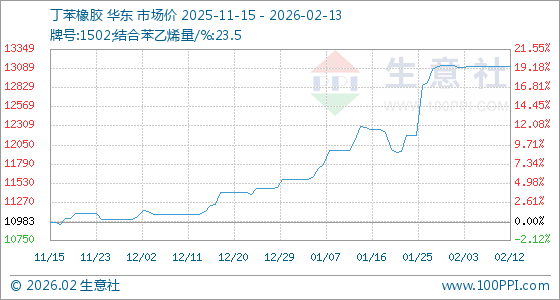 2月13日,生意社丁苯橡胶基准价为13125.00元/吨,与本月初(13133.33元/吨)相比,下降了0.06%。