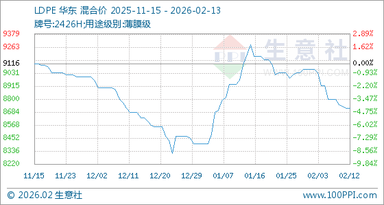 2月13日,生意社LDPE基准价为8716.67元/吨,与本月初(9066.67元/吨)相比,下降了3.86%。