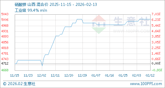 2月13日,生意社硝酸钾基准价为5012.50元/吨,与本月初(5000.00元/吨)相比,上涨了0.25%。