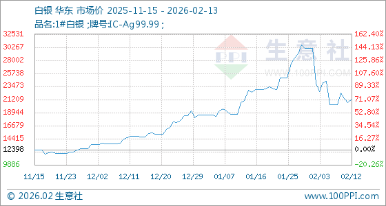2月13日,生意社白银基准价为21307.00元/千克,与本月初(30098.67元/千克)相比,下降了29.21%。