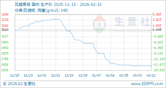 2月13日,生意社瓦楞原纸基准价为2680.00元/吨,与本月初持平。