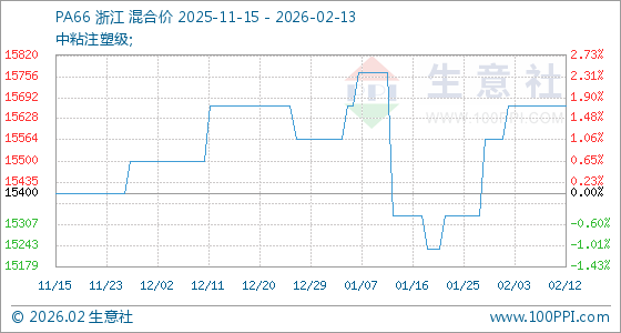 2月13日,生意社PA66基准价为15666.67元/吨,与本月初(15566.67元/吨)相比,上涨了0.64%。