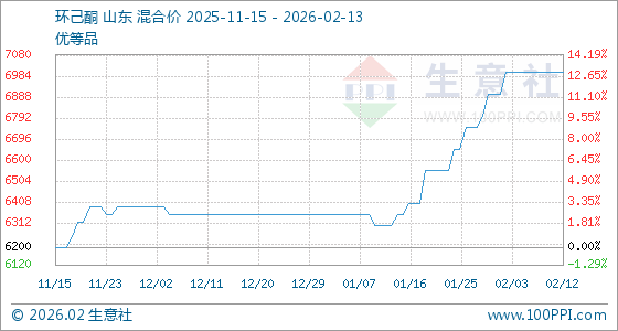 2月13日,生意社环己酮基准价为7000.00元/吨,与本月初(6900.00元/吨)相比,上涨了1.45%。