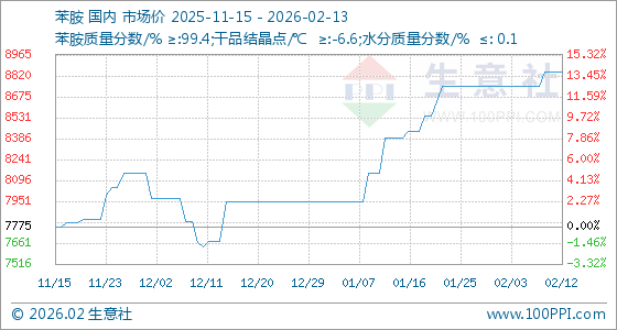 2月13日,生意社苯胺基准价为8845.00元/吨,与本月初(8745.00元/吨)相比,上涨了1.14%。