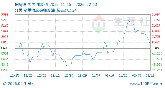 2月13日,生意社棕榈油基准价为8740.00元/吨,与本月初(9196.00元/吨)相比,下降了4.96%。