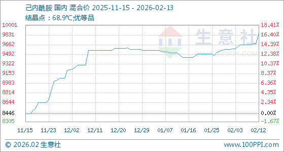 2月13日,生意社己内酰胺基准价为9860.00元/吨,与本月初(9573.33元/吨)相比,上涨了2.99%。