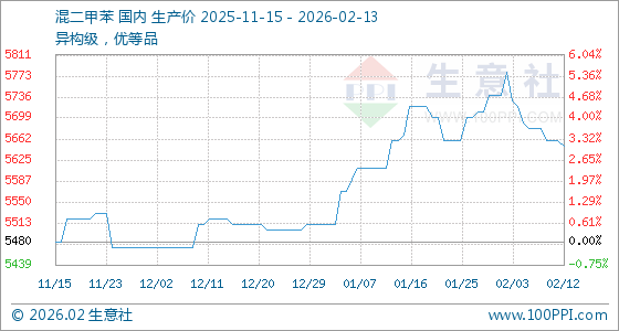 2月13日,生意社混二甲苯基准价为5650.00元/吨,与本月初(5740.00元/吨)相比,下降了1.57%。