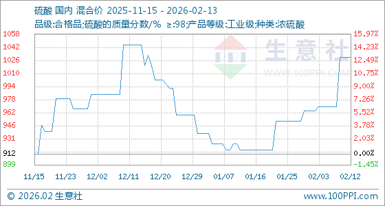 2月13日,生意社硫酸基准价为1030.00元/吨,与本月初(965.00元/吨)相比,上涨了6.74%。