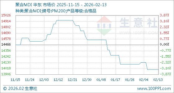 2月13日,生意社聚合MDI基准价为14000.00元/吨,与本月初(14100.00元/吨)相比,下降了0.71%。