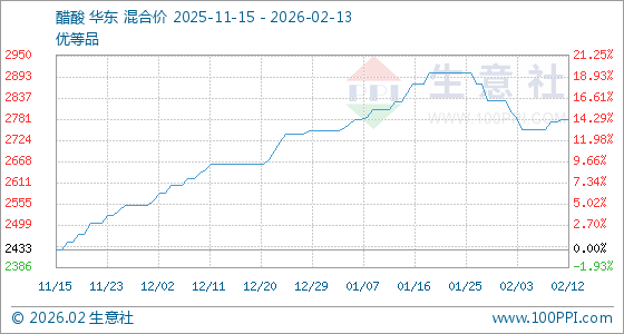 2月13日,生意社醋酸基准价为2780.00元/吨,与本月初(2830.00元/吨)相比,下降了1.77%。