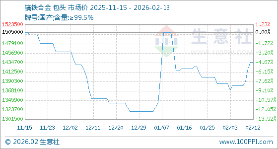 2月13日,生意社镝铁合金基准价为1435000.00元/吨,与本月初(1385000.00元/吨)相比,上涨了3.61%。