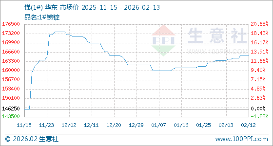 2月13日,生意社锑(1#)基准价为165500.00元/吨,与本月初(163500.00元/吨)相比,上涨了1.22%。