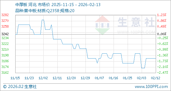 2月13日,生意社中厚板基准价为3192.00元/吨,与本月初(3202.00元/吨)相比,下降了0.31%。