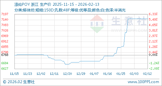 2月13日,生意社涤纶POY基准价为7150.00元/吨,与本月初持平。