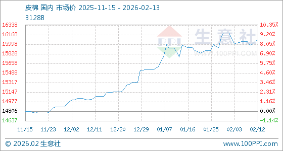2月13日,生意社皮棉基准价为16083.83元/吨,与本月初(16196.50元/吨)相比,下降了0.7%。