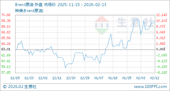 2月13日,生意社Brent原油基准价为69.40美元/桶,与本月初(69.59美元/桶)相比,下降了0.27%。