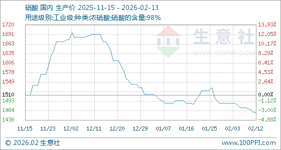 2月13日,生意社硝酸基准价为1460.00元/吨,与本月初(1486.67元/吨)相比,下降了1.79%。