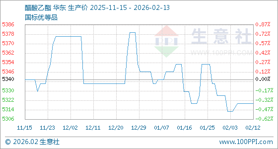 2月13日,生意社醋酸乙酯基准价为5320.00元/吨,与本月初(5326.67元/吨)相比,下降了0.13%。
