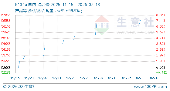 2月13日,生意社R134a基准价为56666.67元/吨,与本月初(56333.33元/吨)相比,上涨了0.59%。