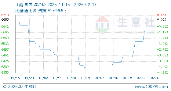 2月13日,生意社丁酮基准价为6616.67元/吨,与本月初(6550.00元/吨)相比,上涨了1.02%。