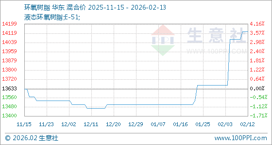 2月13日,生意社环氧树脂基准价为14133.33元/吨,与本月初(13666.67元/吨)相比,上涨了3.41%。