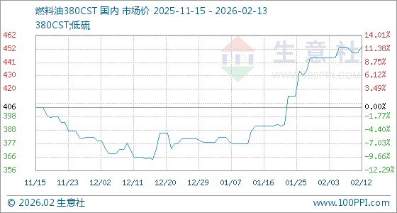 2月13日,生意社燃料油380CST基准价为454.00美元/吨,与本月初(445.00美元/吨)相比,上涨了2.02%。