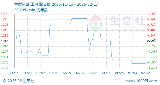 2月13日,生意社重质纯碱基准价为1201.43元/吨,与本月初(1202.86元/吨)相比,下降了0.12%。