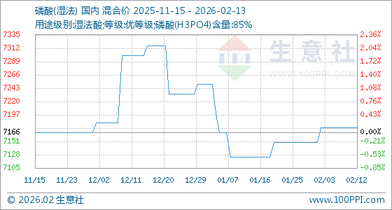 2月13日,生意社磷酸(湿法)基准价为7175.00元/吨,与本月初(7150.00元/吨)相比,上涨了0.35%。