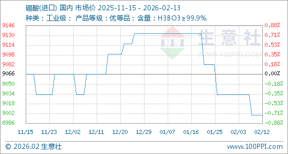 2月13日,生意社硼酸(进口)基准价为9000.00元/吨,与本月初(9033.33元/吨)相比,下降了0.37%。