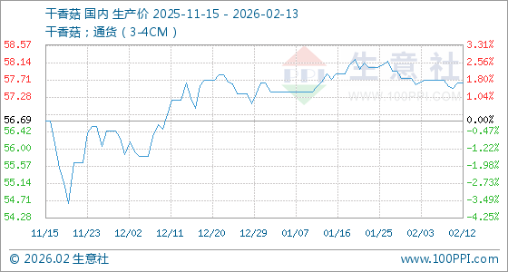 2月13日,生意社干香菇基准价为57.64元/公斤,与本月初(57.74元/公斤)相比,下降了0.17%。