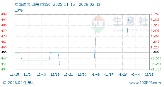 2月13日,生意社次氯酸钠基准价为494.00元/吨 ,与本月初持平。
