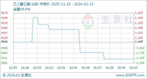 2月13日,生意社乙二醇乙醚基准价为8906.25元/吨,与本月初持平。