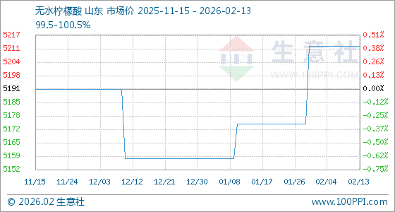 2月13日,生意社无水柠檬酸基准价为5212.50元/吨,与本月初持平。